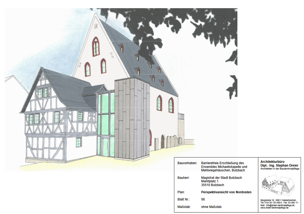 Dieser Entwurf wurde seitens der Fachjury, die die Mehrfachvergabe zur barrierefreien Erschließung begleitet hat, klar favorisiert. Der Magistrat der Stadt Butzbach hat die weitere Umsetzung der ISEK-Entwicklungsmaßnahme Michaeliskapelle/ Mehlwiegehäuschens unter Berücksichtigung des Entwurfs des Architekturbüros Dreier beschlossen.