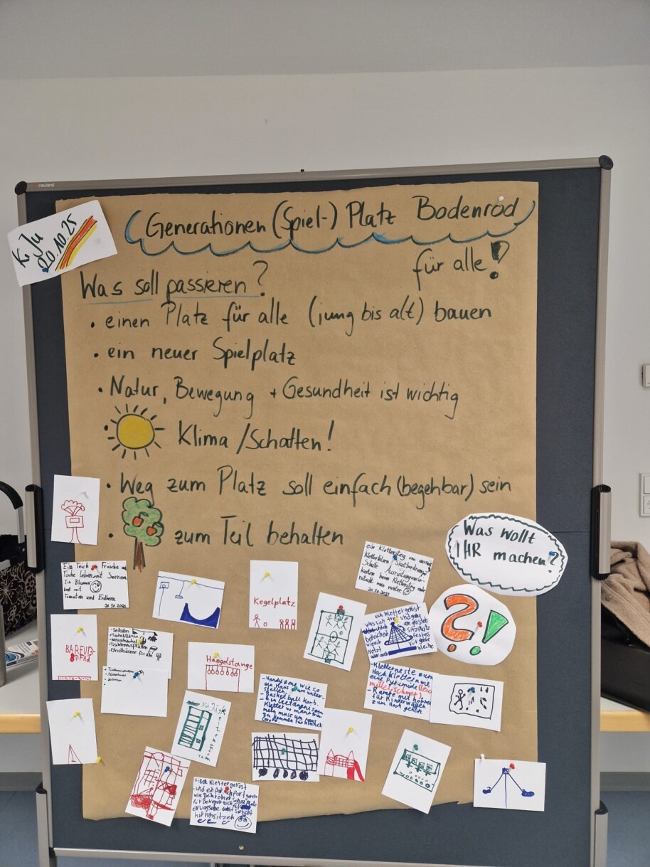 In einem eigens für junge Menschen konzipierten Workshop am 20. Oktober 2025 konnten Kinder und Jugendliche aus dem Stadtteil ihre Ideen, Wünsche und Vorstellungen einbringen. Dabei wurden zahlreiche Anregungen gesammelt – von klassischen Spielgeräten über Bewegungsangebote wie Kletter- und Balanciermöglichkeiten bis hin zu Rückzugs- und Aufenthaltsbereichen, die besonders bei älteren Kindern und Jugendlichen gefragt sind. Auch ökologische Aspekte wie naturnahe Materialien, Schattenbereiche und Treffpunkte unter Bäumen spielten in den Diskussionen eine Rolle.