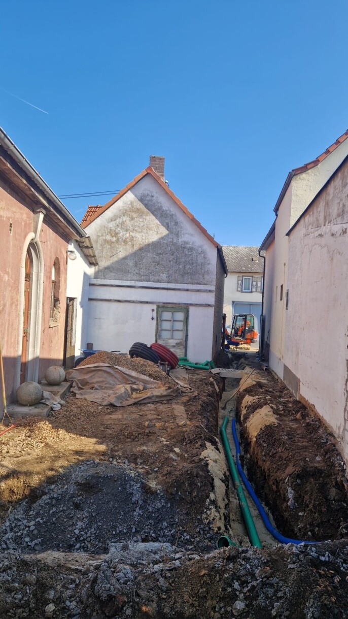 Aktuell laufen Arbeiten zur grundlegenden Erschließung des Grundstücks. Bisher verfügte das Gebäude über keinen eigenen Stromanschluss, der nun hergestellt wird. Gleichzeitig wird – im Vorgriff auf die spätere Sanierung – die Entwässerungsleitung erneuert. Zudem wird bereits jetzt ein Leerrohr für eine zukünftige technische Anbindung, beispielsweise über Internet bzw. Glasfaser, mitverlegt.