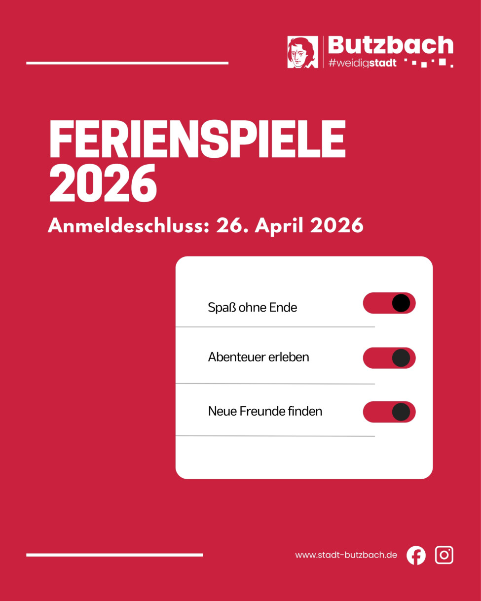 Die Stadt Butzbach organisiert auch 2026 wieder die beliebten Ferienspiele für Kinder im Alter von 6 bis 13 Jahren. Wie in jedem Jahr finden die Ferienspiele in den ersten beiden Wochen der Sommerferien in der Weidigschule statt. Vom 29. Juni bis 10. Juli 2026 erwartet die Kinder montags bis freitags jeweils von 9:00 bis 13:00 Uhr ein abwechslungsreiches Programm mit Spiel, Sport, Schwimmbadbesuchen, Bastelangeboten, Besichtigungen und weiteren Aktionen.